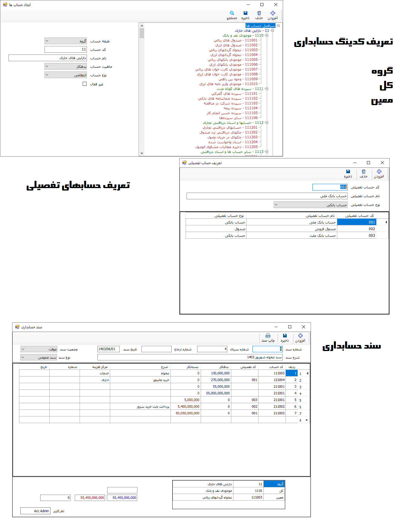 - حسابهای کل و معین و تفصیلی بصورت پیش فرض تعریف شده است
